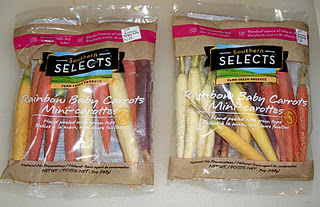 So on impulse I picked up a bag of these at the grocery store last week. They’re not cheap, but they come all peeled and ready to go in a handy little cello pack, so all you have to do is cook them just like regular carrots: steam ’em, roast ’em (olive oil, onions, salt and pepper at 350 for half an hour or so), throw ’em in with your roast chicken. The only way they could be less work is if they cooked and digested themselves. And as an added bonus, when you serve them to guests, you actually look like you know what the hell you’re doing. Very restaurant-y, and they provide a new twist on an old staple. Do they taste any different than regular carrots? Not so’s you’d notice, but one assumes the purple ones have a slightly higher nutritional content, and it makes for a change, so what the hell.