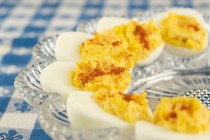 Now, before you turn up your foodie nose, let me assure you that a tray of deviled eggs at a party goes faster than tissues in Whitney Houston’s dressing room. I swear, people LOVE them. Of course recipes vary, but I tend to be a bit of a purist. Boil those bad boys up, slice ‘em in half, scoop out the yolk, chop up a couple of whites (you can leave this out, but I like it this way), mix in some mayo, mustard, salt and pepper and mound it up. I don’t hold with adding curry powder, onions or suchlike, but if you feel the need to tart them up with a little smoked salmon or even a shrimp, have at it. I do shake a little paprika over the tops just for color.