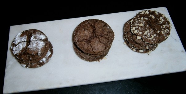 The chocolate crinkle offers no such problem, as no Crisco is involved, at least in my version. Betty’s original recipe calls for vegetable oil, but I substitute melted butter and it creates a far better cookie. Betty also calls for vanilla extract, but I substitute almond extract for half of the vanilla. When rolled in toasted, ground almonds, this version offers a deep, dark not-too-sweet flavor that’s pleasing to adults, and for dinner parties they make a nice dessert. You can pair them with a scoop of ice cream — Ben and Jerry’s Cherry Garcia or Mission to Marzipan work well — or little shot of Kirsch.