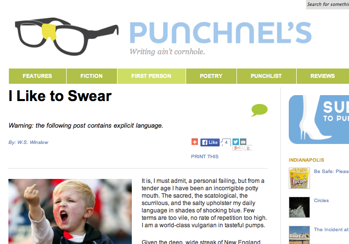 My piece even includes an explicit language warning and the teaser, “W.S. Winslow works blue.” So in addition to being amused and perhaps a bit scandalized — and really who doesn’t enjoy the illicit frisson of a good scandalizing, especially on a Monday morning? — you can share in the satisfaction of my little exercise in pushing the limits of the First Amendment.