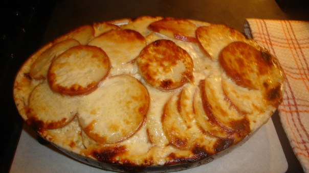 Over the course of my life I have met only one person who actively dislikes potato gratin; unfortunately it is my daughter. As a result, I generally reserve this dish for company or special occasions so as to avoid seeing it pushed away, untouched, with a moue of distaste. Of course it’s a mercy, too, as I could eat the stuff three meals a day, pausing only to check on my order upgrade at the Scooter Store or to mainline yet more Lipitor.